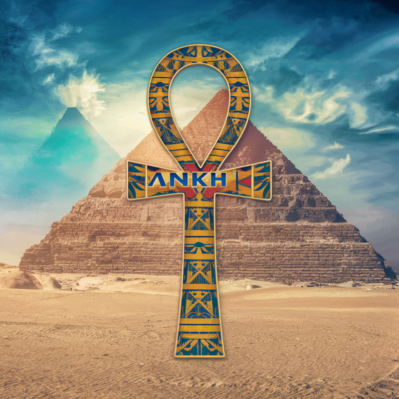 An ancient Egypt symbol Ankh with the word "Ankh" in the middle and alandscape including a pyramid in the backround