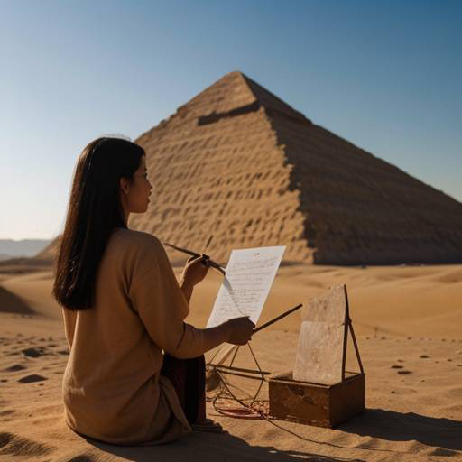 A scribe carving hieroglyphics on an ancient egyptian temple in a serene Egyptian oasis, surrounded by palms and sand
